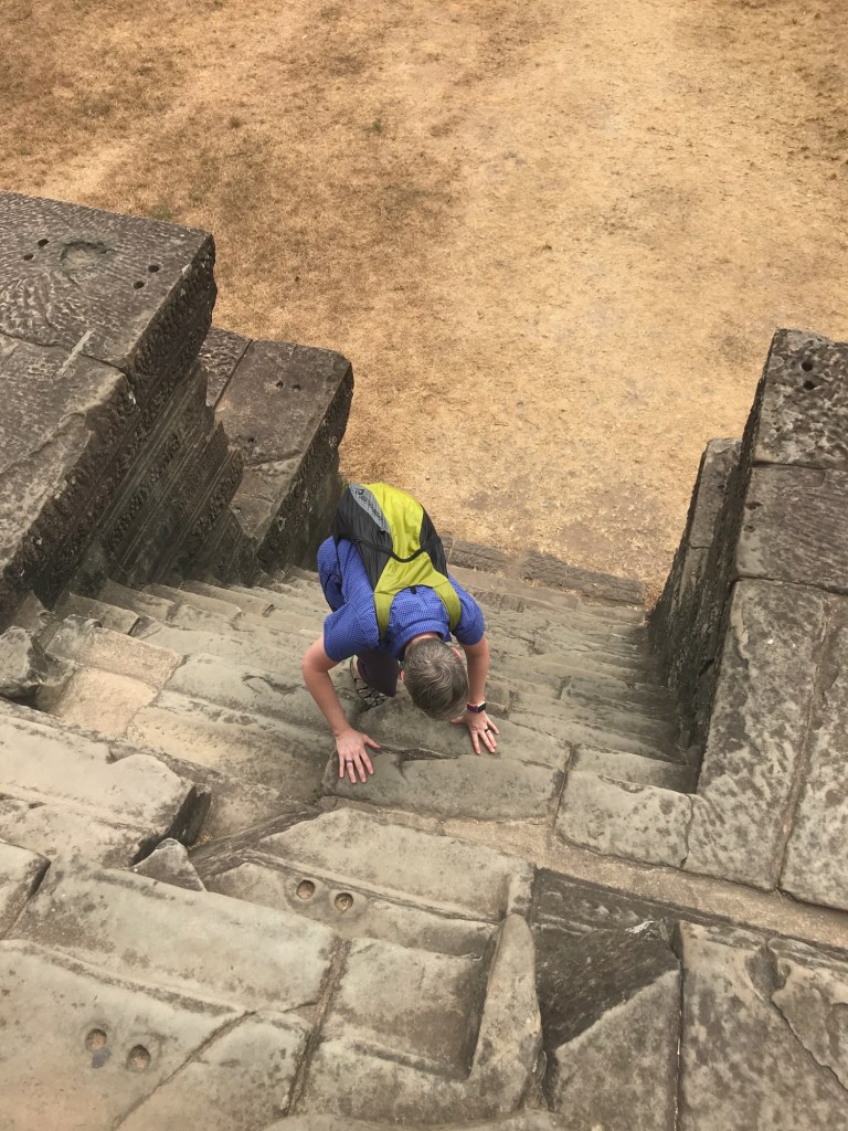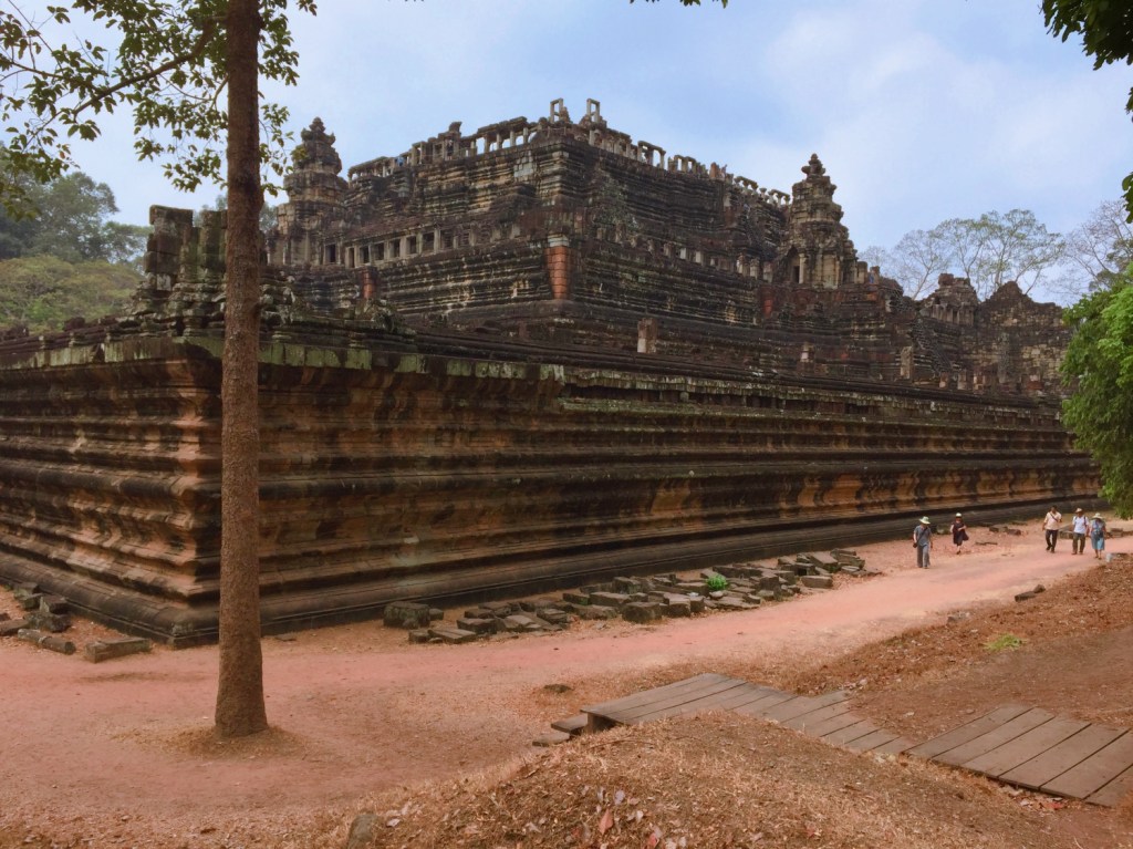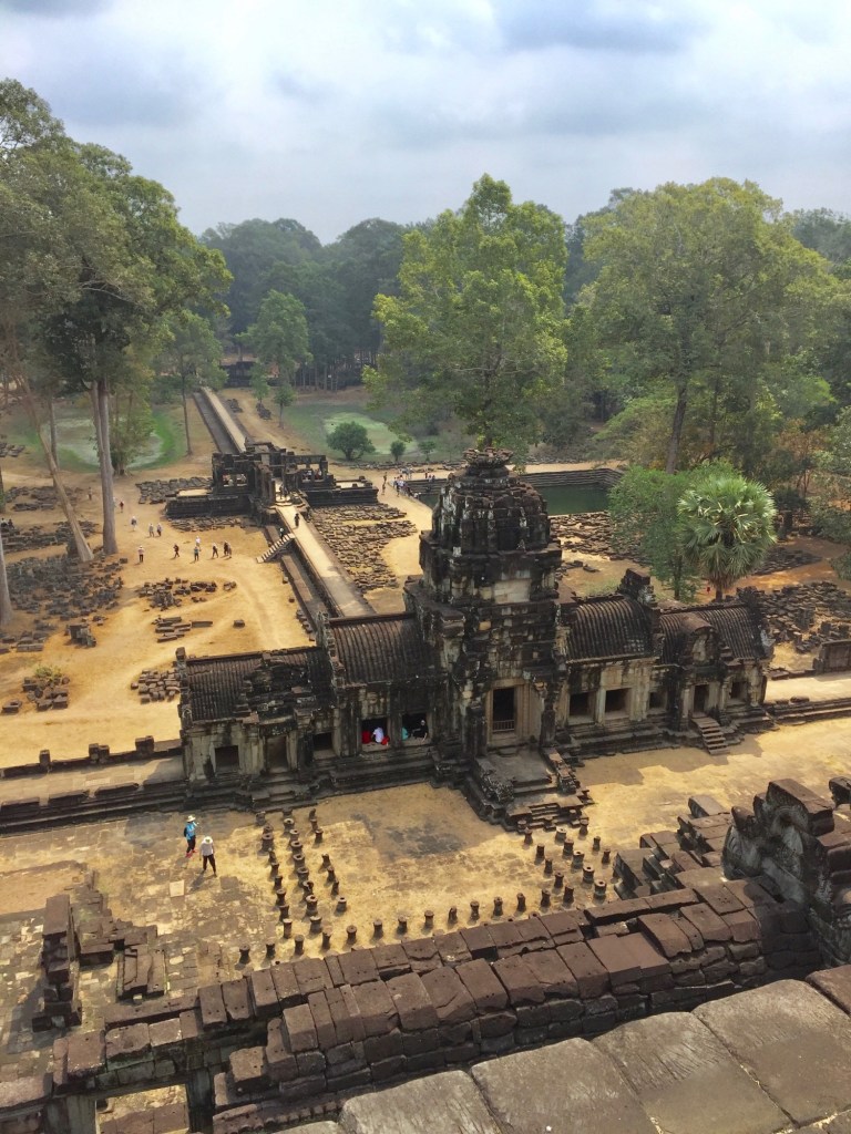 One of our other favorite parts of Angkor Thom was the Hindu temple Baphuon. It predates the city and was built in 1060 CE by king Udayadityavarman II, dedicated to the god Siva. This temple has a 225-meter long elevated sandstone walkway to reach the temple, and then a frighteningly steep set of stairs leading up to a terrace with amazing views around the city. The temple was meticulously rebuilt after it became unstable from standing on uneven ground for almost a thousand years. Getting up there was a challenge but very worth it!