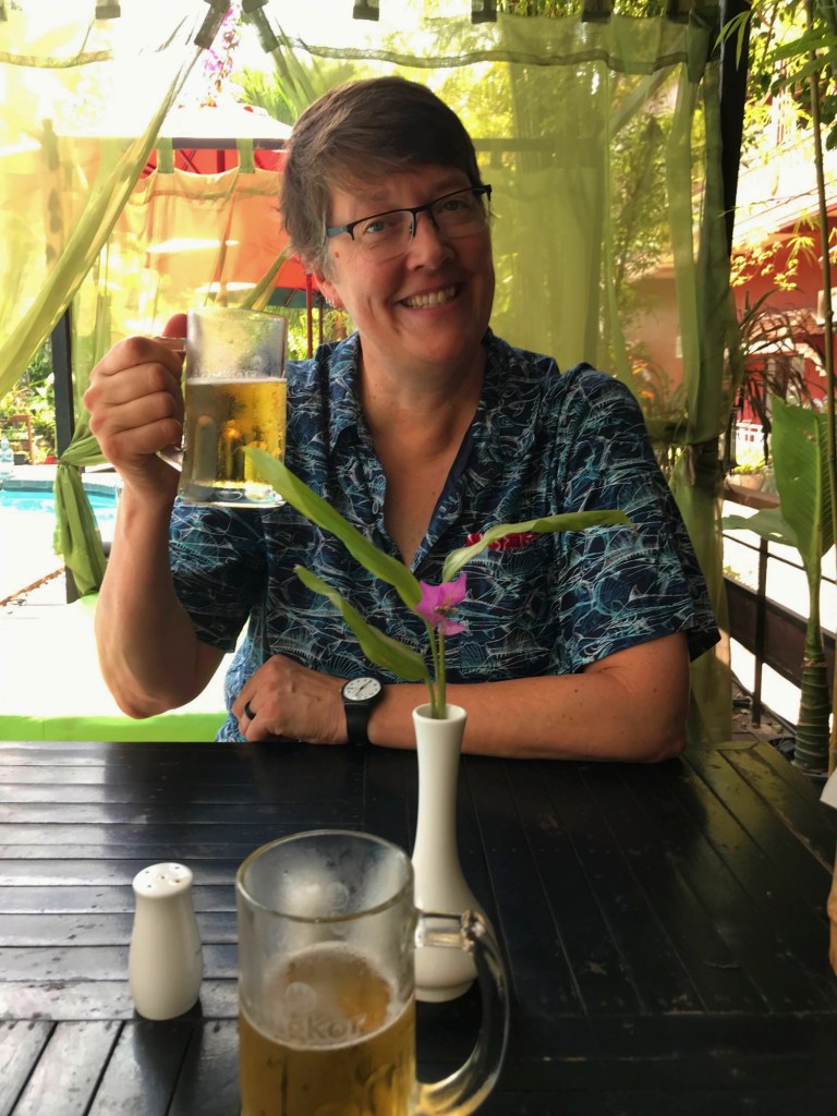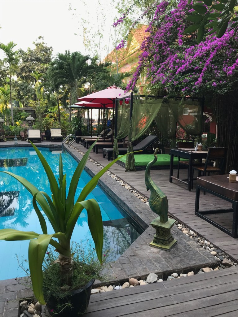 Our housing options as full-time travelers range from a hotel booked with points or dollars, a rental home such as an Airbnb, or a house sit. In Siem Reap I booked a hotel and paid for it in real dollars. We stayed at the Mekong Angkor Deluxe Hotel for a grand total of $254.82 for 6 nights. It was relatively expensive for SE Asia so this stay counts as overspending for us in this region. We really liked the hotel, the staff, our room, and the location we were in. And we loved hanging out in the patio area by the pool every night for happy hour, sometimes working on our computers and other times just playing cards and chatting.