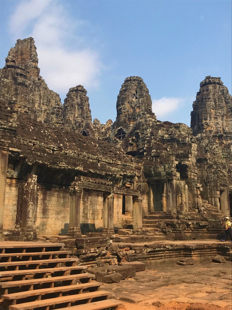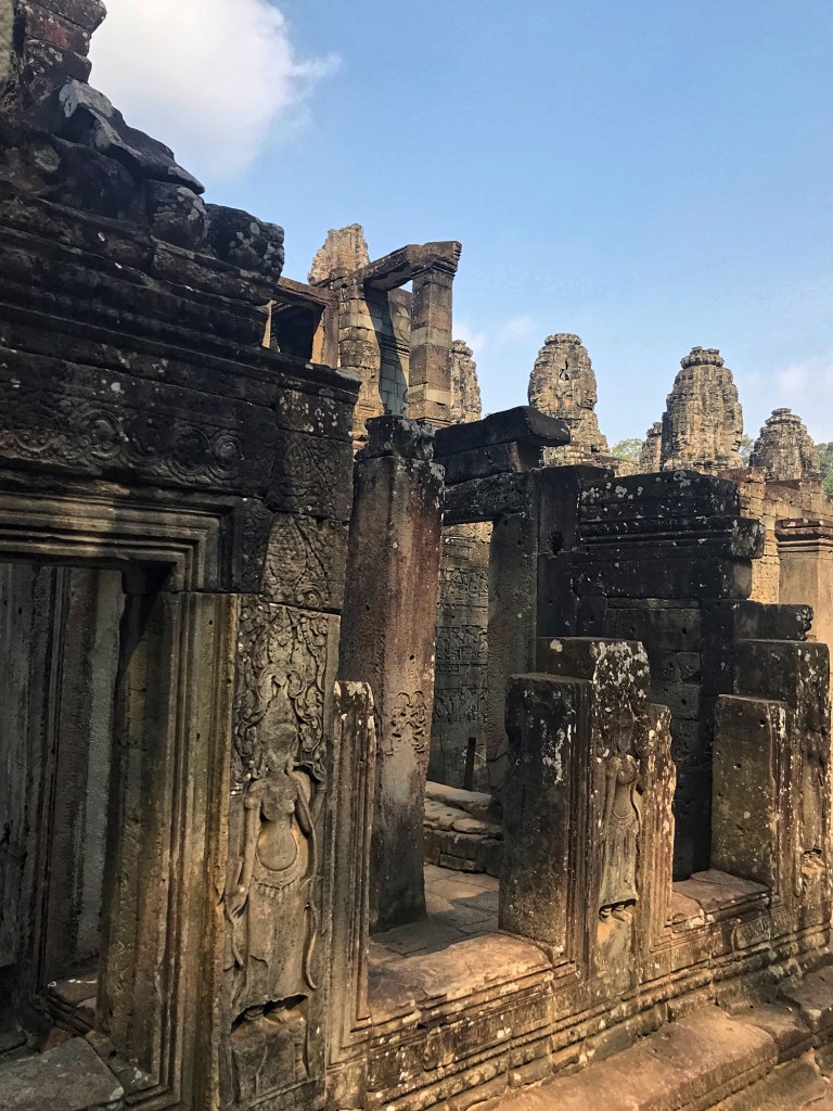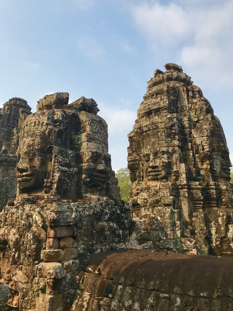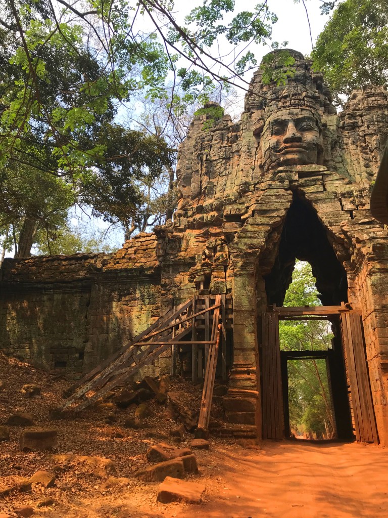 Angkor Thom doesn’t follow classical Khmer architectural styles, it was designed in a new Khmer style which is characterized by the Bayon temple that sits at the center of the city. Bayon was built as a Mahayana Buddhist temple and is uniquely recognizable because the towers are covered with 216 smiling faces. Experts love to debate whether the smiling faces represent King Jayavarman VII himself, or a likeness of the Buddha, or both. And of course this architectural style is recognizable for fans like me of the 2001 movie “Lara Croft: Tomb Raider,” since some scenes with those fabulous smiling stone faces were filmed there.