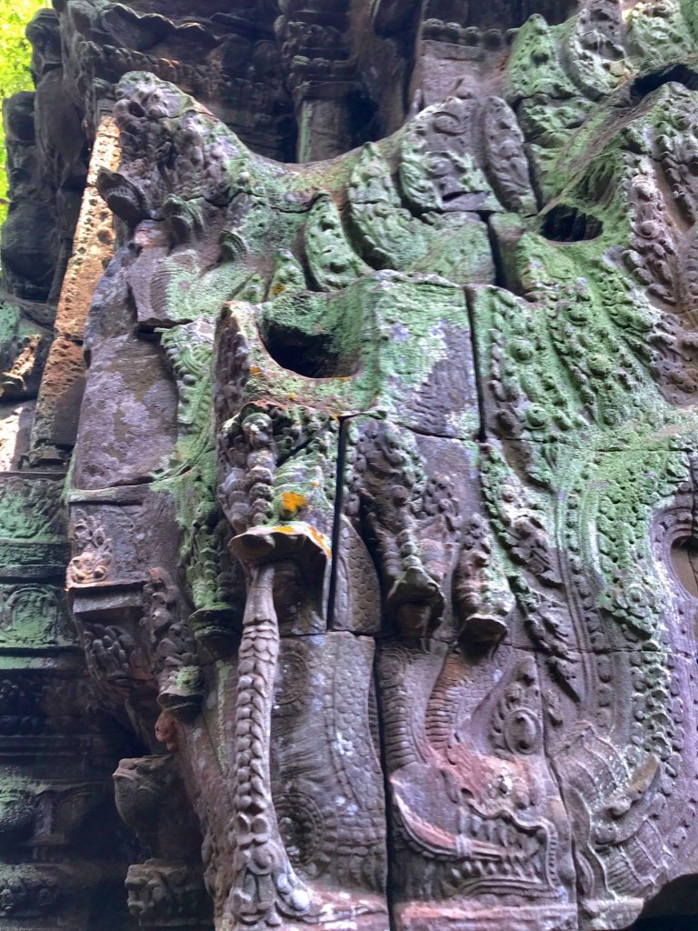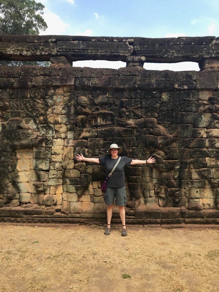 We found impressive carvings on structures all around the city. The Terrace of the Elephants was one of our favorites, because of the elephants as well as the garudas (human-like birds from Hindu mythology). This terrace is 300-meters long and 2.5-meters tall, and it’s the spot where King Jayavarman VII sat to observe public ceremonies in his city.