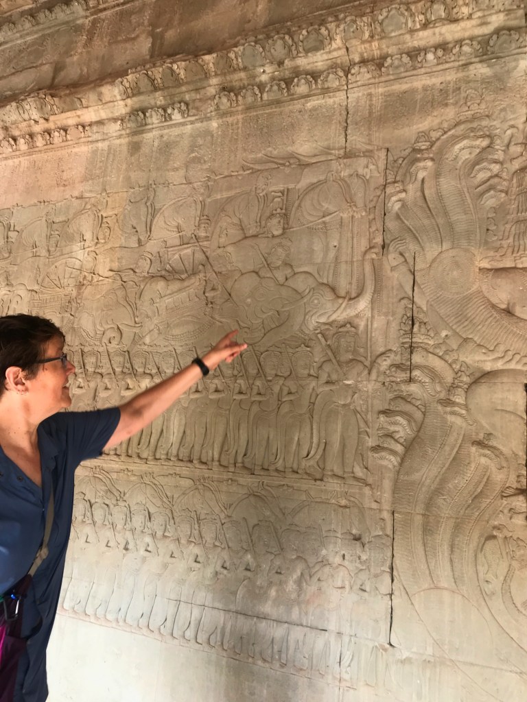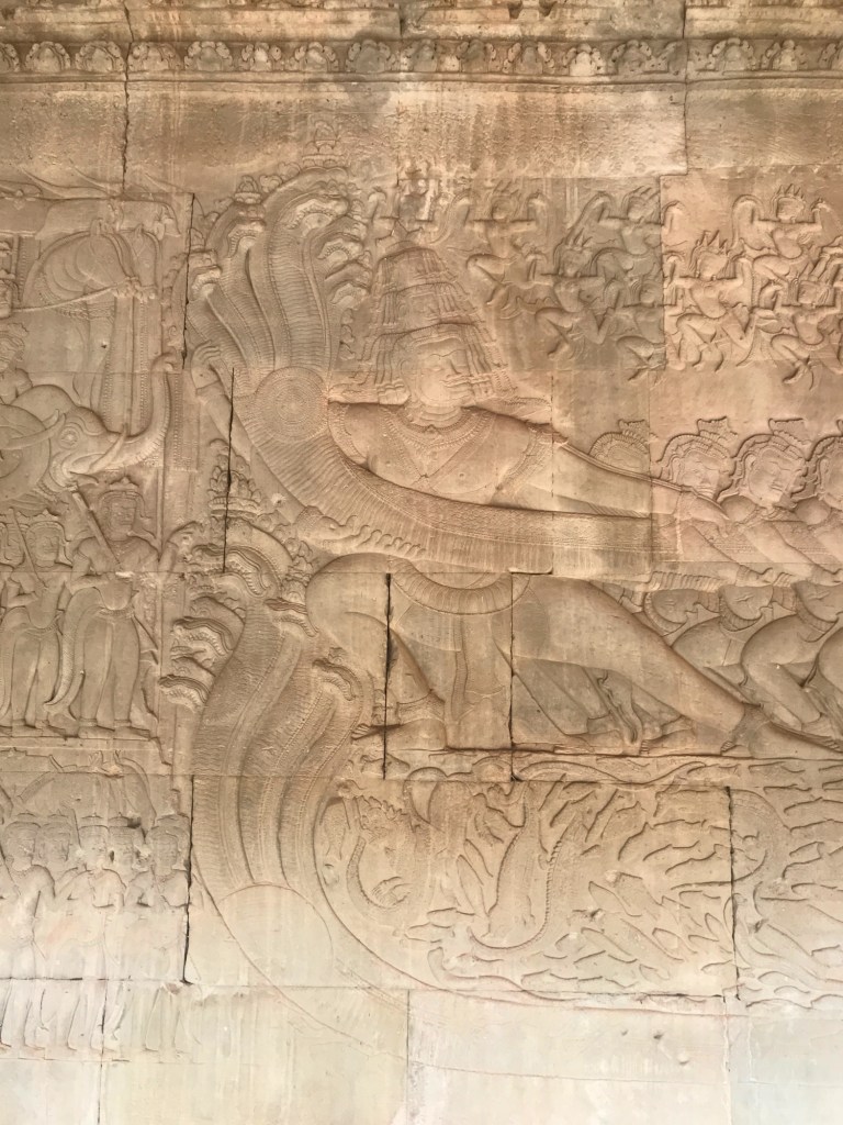 The main Hindu element of the temple complex is the overall design with 5 stone towers depicting the 5 mountain peaks of Mount Meru, the sacred mountain of Hindu cosmology. The temples are covered with carvings in the sandstone, and the most famous one is the “Churning of the Ocean of Milk” illustrating the creation of the universe and the victory of good over evil. Seeing all of this impressive artwork in a jungle setting, was more fun than visiting any museum!