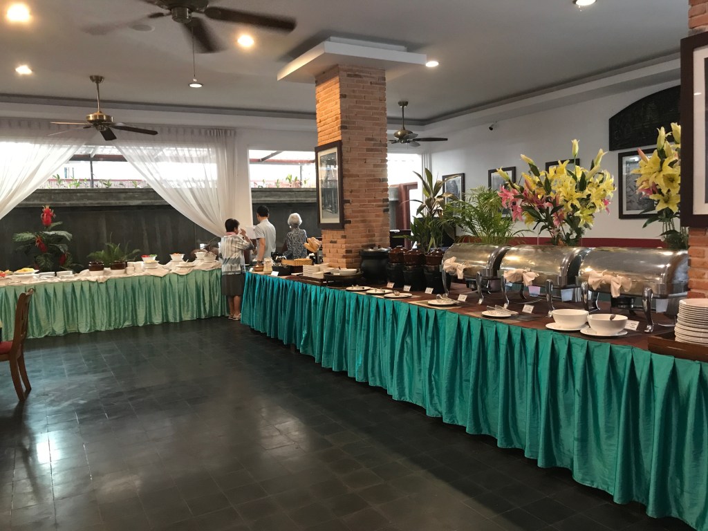 We had excellent free hotel breakfasts everyday with great coffee and lots of those funny little thumb-sized bananas. Most of the dishes were intended to be very recognizable for westerners, which we did not mind. But there were some more traditional Cambodia dishes included most of the time. The number and variety of dishes for such a small hotel was pretty impressive. But the tiny thumb-sized bananas were the most impressive of course. We also had really cheap happy hour dinners at the hotel almost every night. Free and cheap are always awesome!