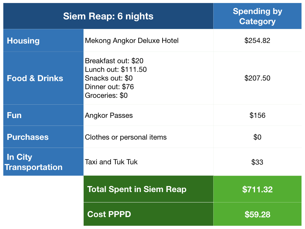 Our actual daily spending in Siem Reap averaged out to $59.28 per person per day, or $118.56 per day for the two of us. That means we spent 103% of our average daily budget. In SE Asia where everything is supposed to be so cheap! Since we did nothing luxurious or fancy in any way, that is shocking. But at the same time, our budget is based on normal living expenses, and we were basically on vacation with no attempt to live like locals at all so that’s actually not a huge surprise. Our hotel was too pricey and eating restaurant food every day, even cheap restaurant food, really adds up. And of course the park passes were expensive at $78 per person. So really our trip to Siem Reap was more like a vacation and not at all like our new normal way of living in the places we visit as nomads. Though it definitely felt worth it.