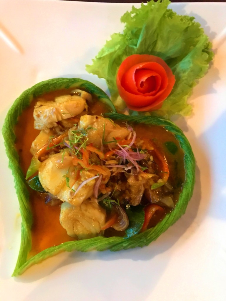 Fish amok: Another signature dish of Cambodia! This steamed fish in Khmer curry was seriously outstanding. We were shocked and very pleased at how flavorful and much less spicy the Khmer curry was compared to the curries we’ve tried in other countries. It was rich with coconut cream, fish sauce, turmeric, lime, lemongrass, garlic, and shallots. And the sauce was captured by an adorable heart-shaped wall of cucumbers that were fun to eat at the end after they sat in the sauce for a while. Yummy!