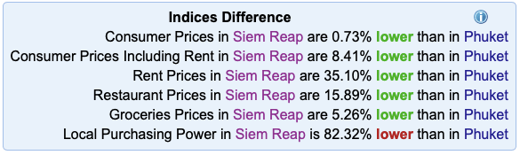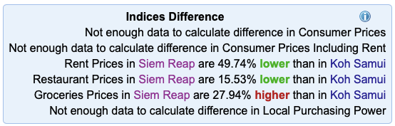 Siem Reap is the village closest to Angkor Archaeological Park, which is the most popular tourist destination in Cambodia. As it should be! Out of curiosity I decided to compare prices in Siem Reap to a couple of the other destinations we visited in SE Asia that also have extremely high tourism numbers. I picked Phuket and Koh Samui in Thailand to compare to since the economies in those locations also depend on tourism. The results from numbeo.com are included below.