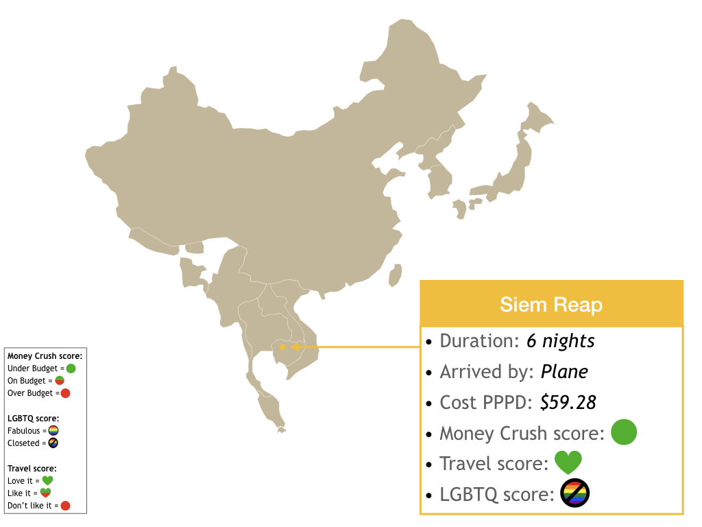 Tourism is critical enough in Cambodia for gay bars, drag shows, and pride festivals exist in Siem Reap and Phnom Penh. But that’s not how we score a location. What’s more important is knowing that LGBT+ Cambodians deal with bullying in schools, workplace discrimination, rape, forced marriage, shunning, and violence across the country. Some say change is in the air, and lives are improving for LGBT+ Cambodians. We will watch and see how things evolve!