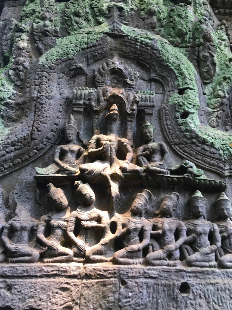 Most of the original bas-relief carvings of Ta Prohm have been destroyed over time but some really interesting carvings have survived. One image from Buddhist mythology shows the “Great Departure” of Siddhartha, the future Buddha, leaving his life of privilege in the palace behind. You can also admire some fearsome devatas (temple guardians), and tranquil meditating monks.
