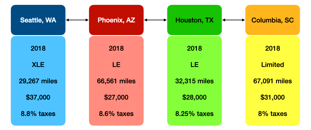 About three months before we bought our car I looked at the available inventory of various Toyota dealerships in our new home state of Arizona to give us some ballpark budgets to start with. That gave us a ton of data and a wide range of vehicle prices for our spreadsheet, including a compact 2019 Corolla Hatchback with 23,790 miles for around $19k, a midsized 2018 Highlander AWD with 66,561 miles for around $27k, a midsized 2016 Tacoma 4WD with 66,777 miles for around $32k, and a full-sized 2019 Tundra 4WD with 21,493 miles listed for around $50k. That’s quite a price range! But it gave us a good idea of what our budget might look like. That also made us realize if we bought a truck it we probably be four years old compared to a two year old SUV to make sure we stuck to our budget.